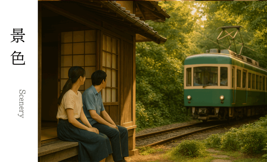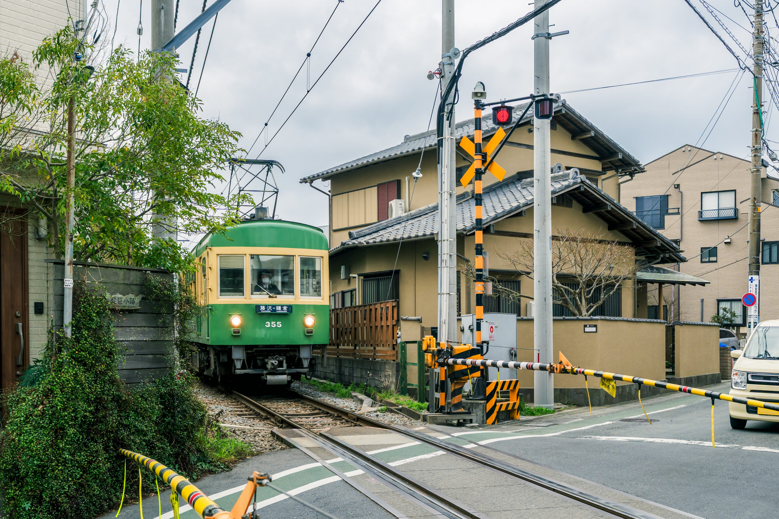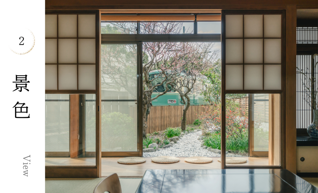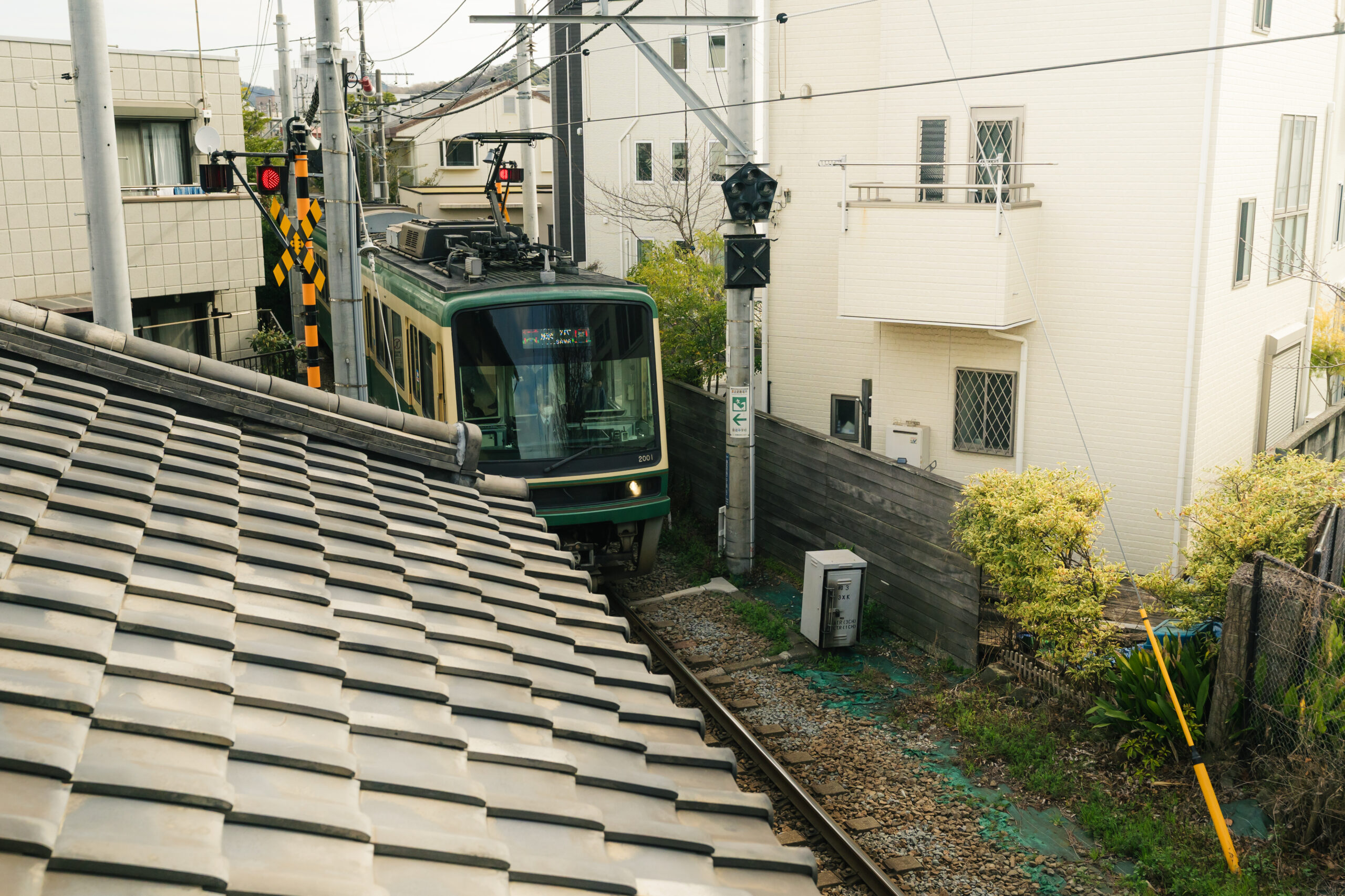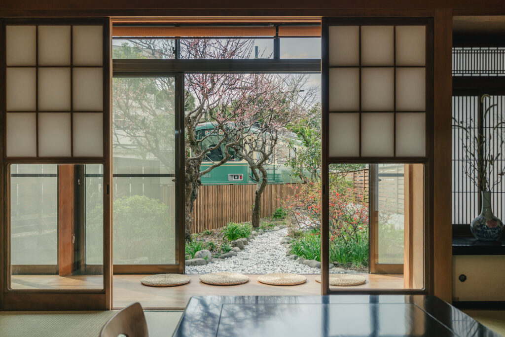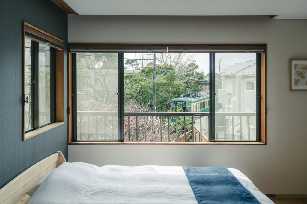 窓辺をゆっくり走る江ノ電が、鎌倉らしい情景を映し出します。