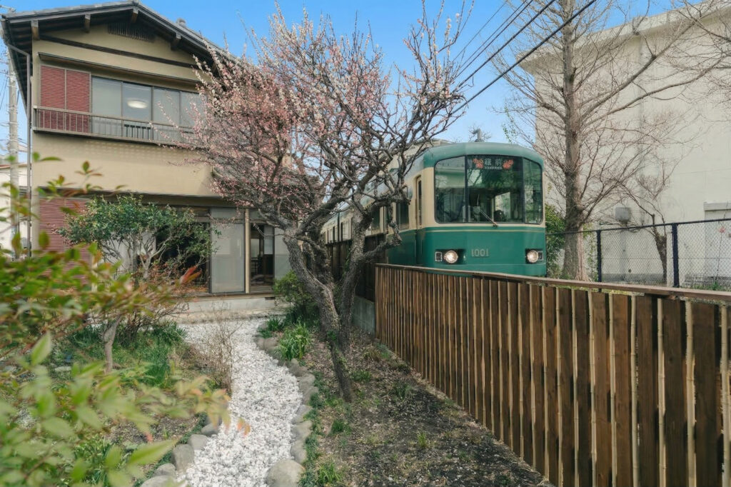 The Enoden train running nearby and the Japanese garden